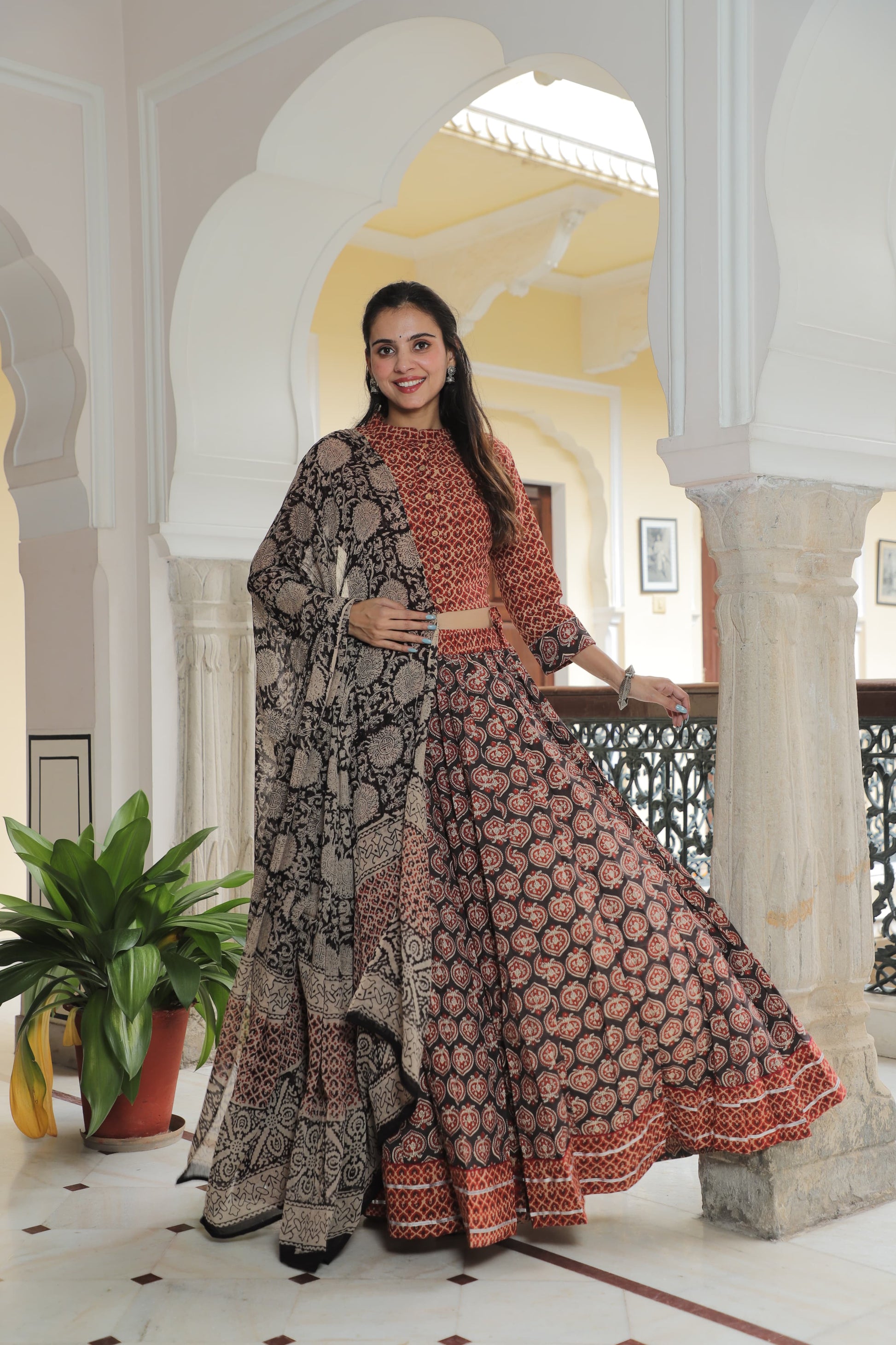 Maroon & Black Bagru Hand Block Print Cotton Lehenga Choli with Gota Patti Detailing